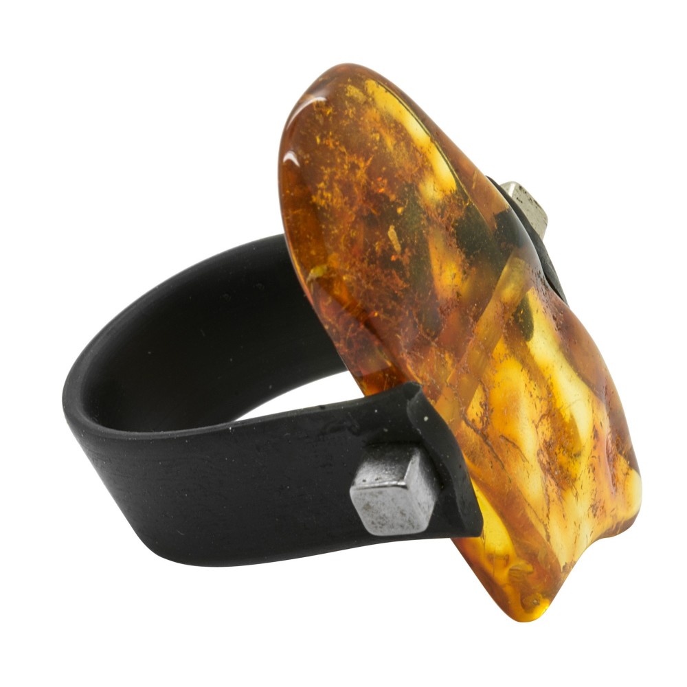 Une bague aux effets très naturels de forme irrégulière et de couleur miel, cette bague ne passera pas inaperçu. Elle est monté sur une lanière en silicone que vous pourrez ajuster à votre doigt