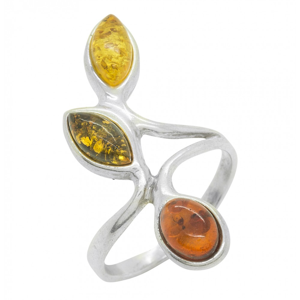 Bague en argent 925/1000 avec 3 perles d'ambre naturel couleur miel, citron et vert. Un design fin et très visuel.