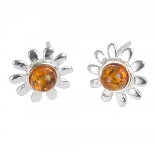 Boucle d'oreille en forme de fleur en Argent 925/1000 et ambre couleur miel.