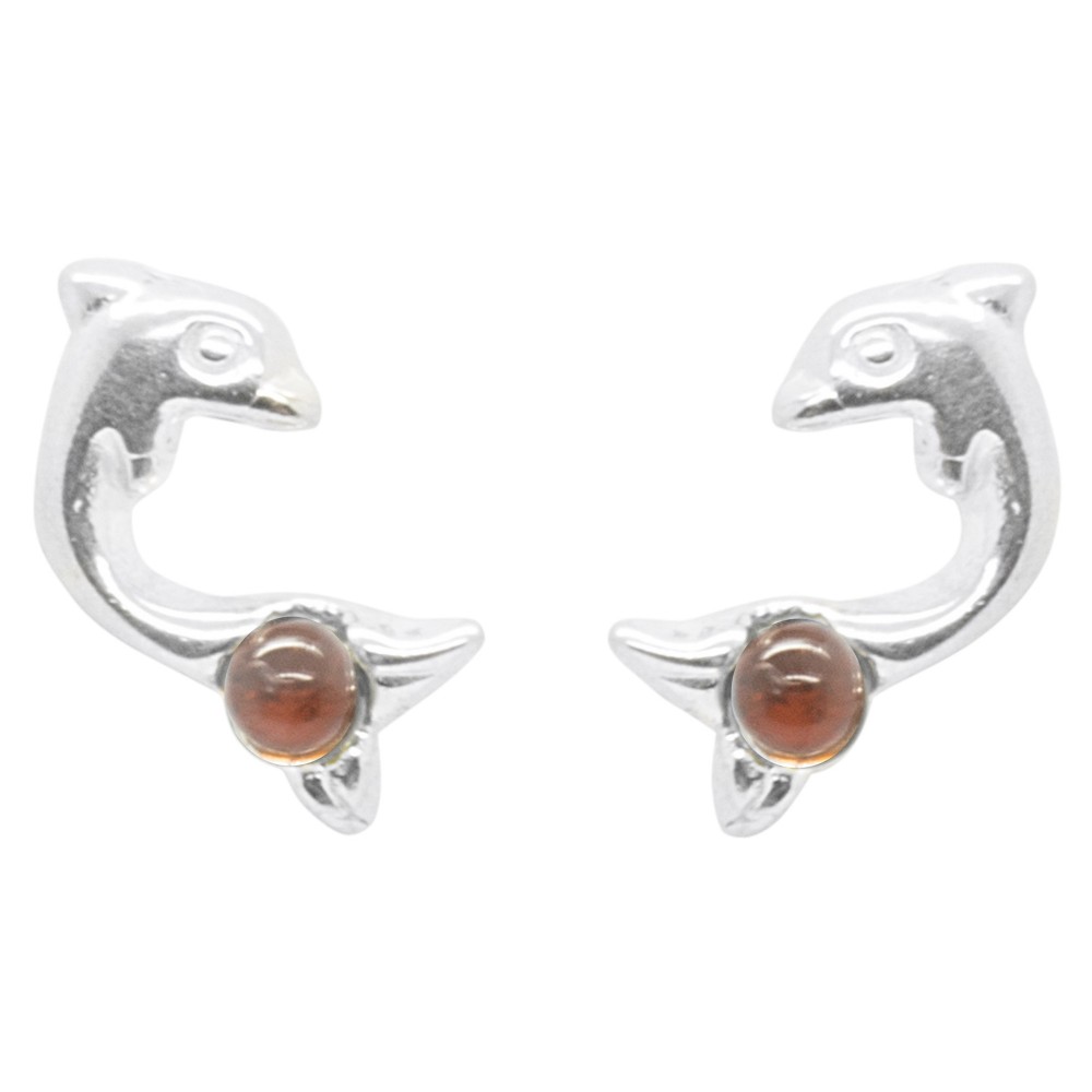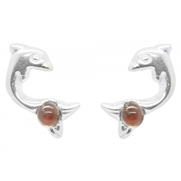 Boucle d'oreille en forme de dauphin en Argent 925/1000 accompagné d'une perle d'ambre véritable disponible dans plusieurs couleur d'ambre