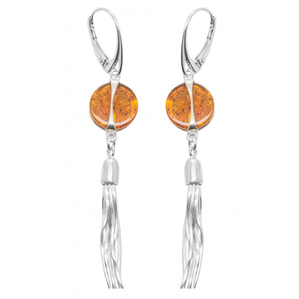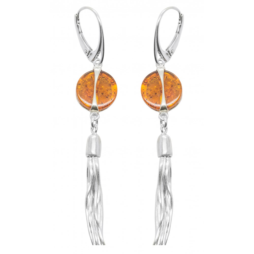 Boucle d'oreille en Argent 925/1000 avec bouton en ambre naturel de couleur miel et cheveux d'ange en argent.