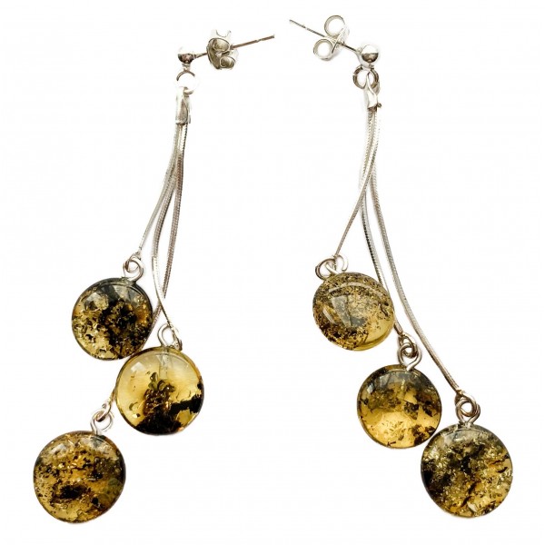 Boucle d'oreille en argent 925/1000 composés de 3 pierres d'ambre en forme de bouton plat de couleur verte.