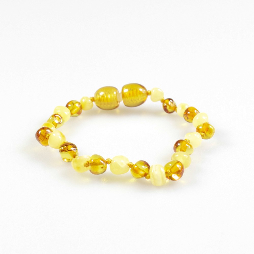 Bracelet en ambre naturel de couleur blanche et miel, chaque perle d'ambre et séparé par un noeud pour le sécuriser.