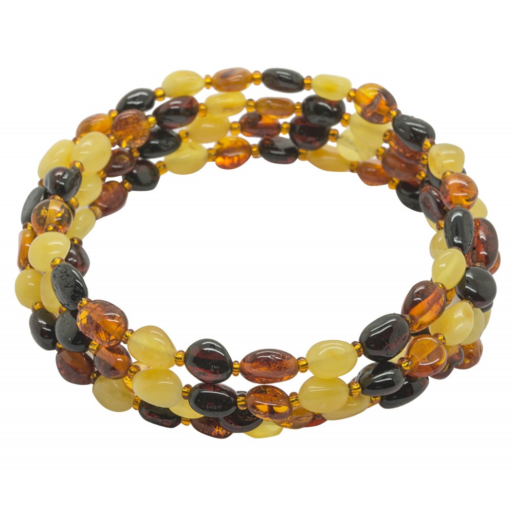 Bracelet type accordeon avec perle d'ambre naturel multicouleur (blanc, ceries et cognac) en forme d'olive.