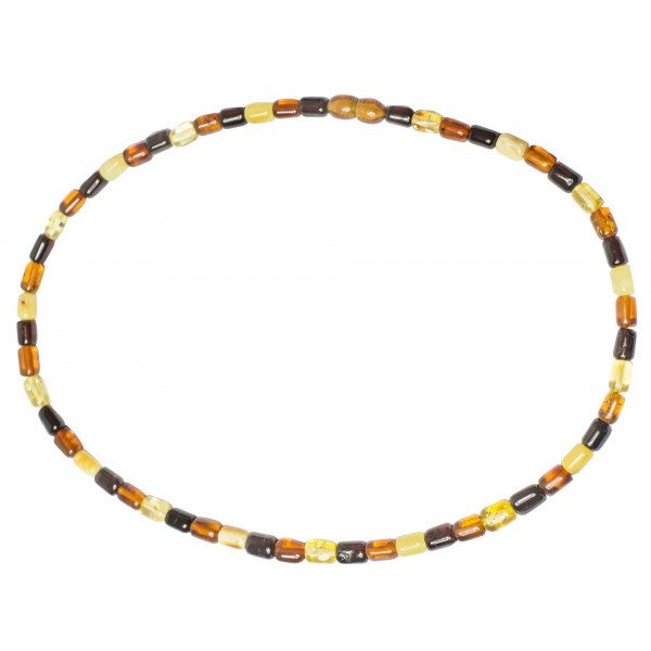 Collier d'ambre naturel frabriqué avec des perles d'ambre cylindrique multicolore. Ce modèle existe aussi en bracelet.