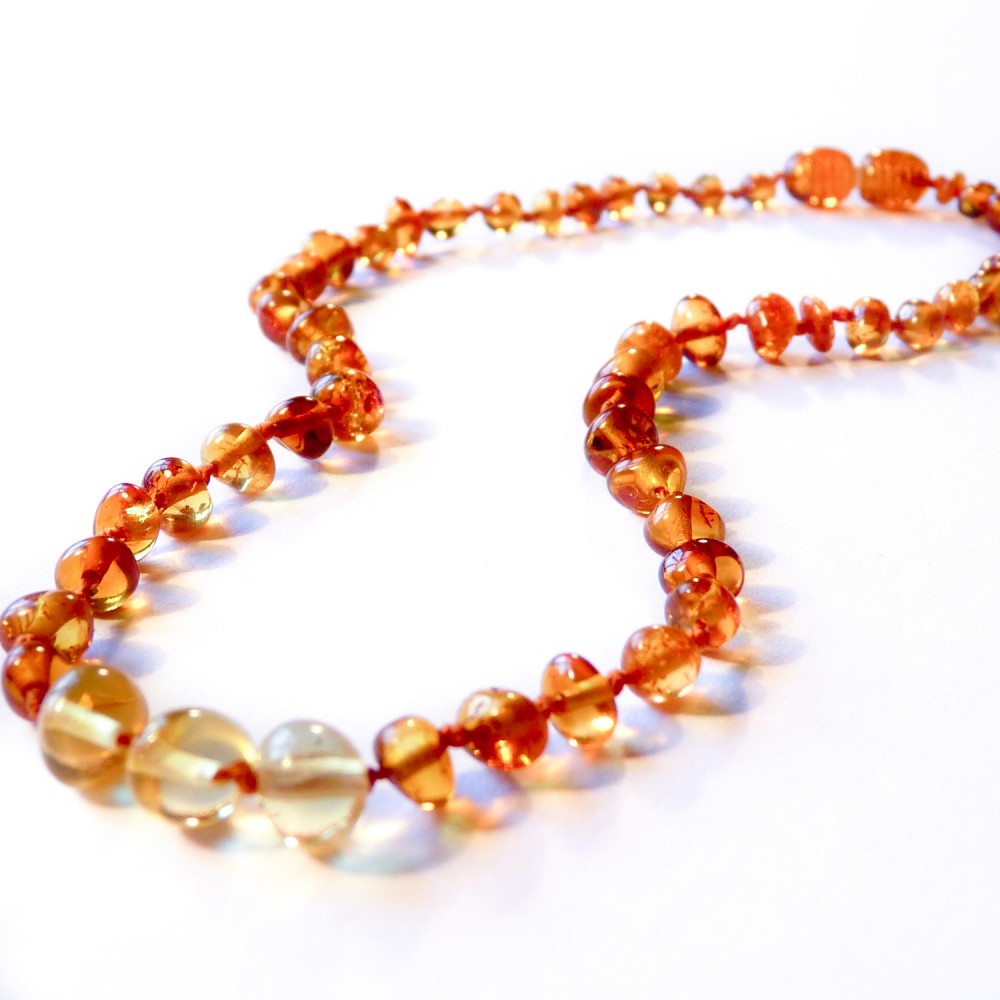Halskette natürliche Bernstein Baby-Farbe Cognac und transparent gelb. Jede Bernsteinperle und durch einen Knoten getrennt, um es zu sichern.
