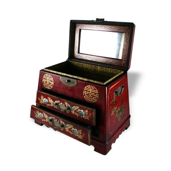 Große Schmuckschatulle, Trapez-, rot und alter chinesischer Stil. Die Muster sind von Hand bemalt.