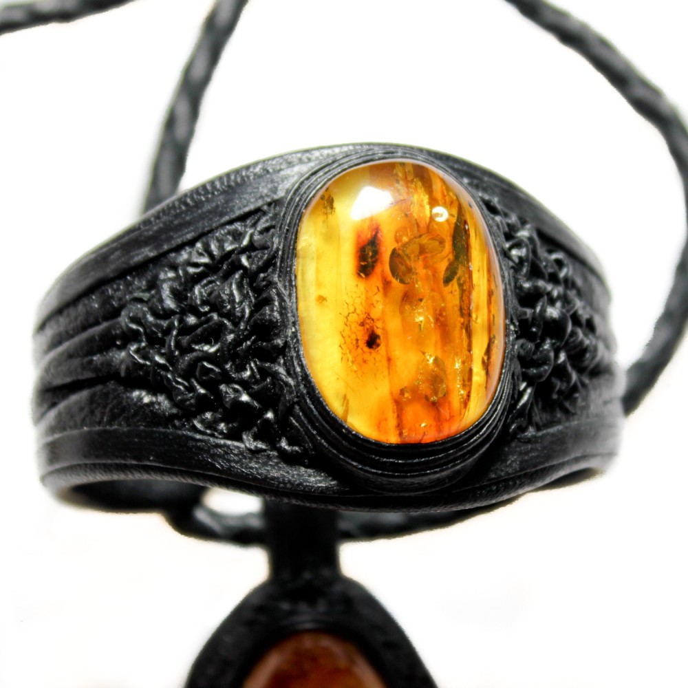 La unión perfecta de ámbar y cuero, este vestido único se compone de una gran piedra de color ámbar.