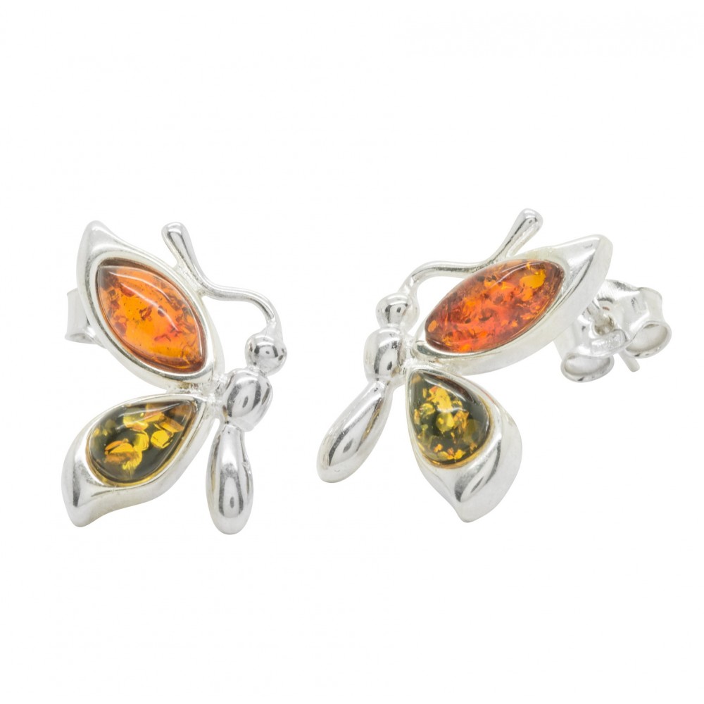 Pendientes de hermosos formado mariposa pendientes hechos de una trama en 925/1000 plata con cuentas de ámbar y verde 2 coñac que conforman las alas.