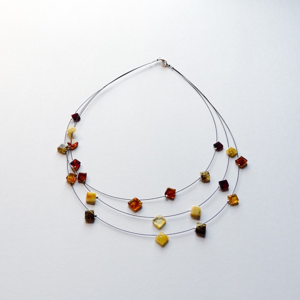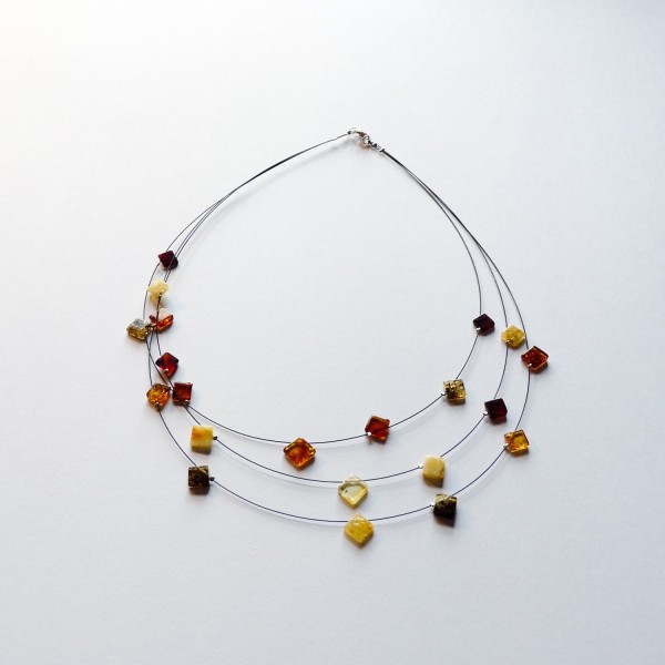 Multicolored natural amber necklace (honey, cognac, lemon and white), mounted on 3 black steel wires.