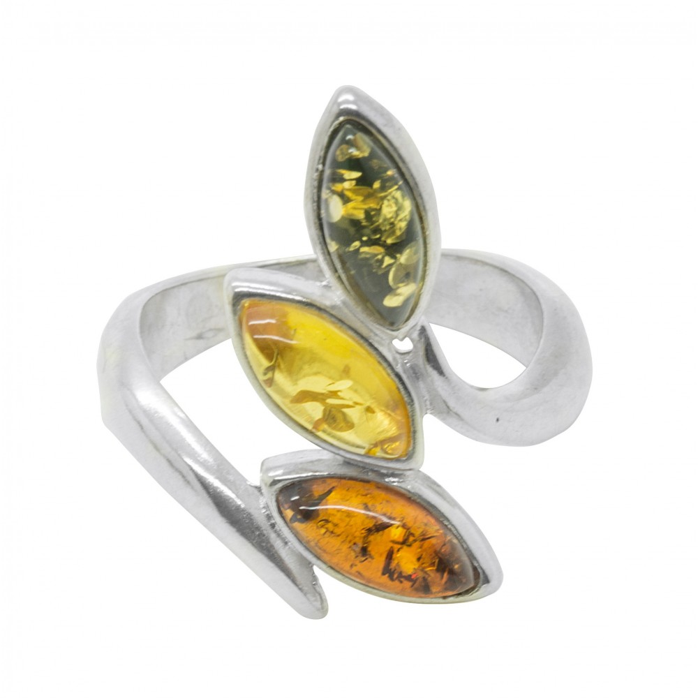 Silver 925/1000 ring with 3 natural amber pearls in honey, lemon and green. A fine and very visual design.