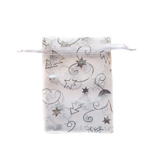 White color organza bag with silver christmas decoration. Size 8.5 cm x 11.5 cm