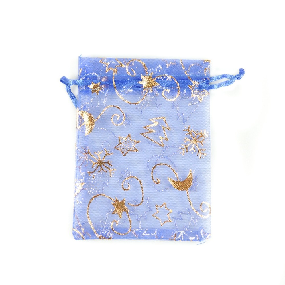Blue organza bag with golden christmas decoration. Size 8.5 cm x 11.5 cm