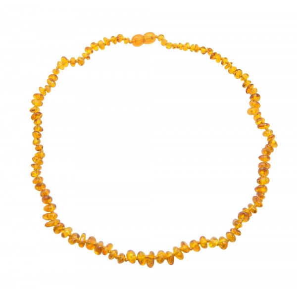 Una collana di ambra con pietre d'ambra cognac forma barocca.