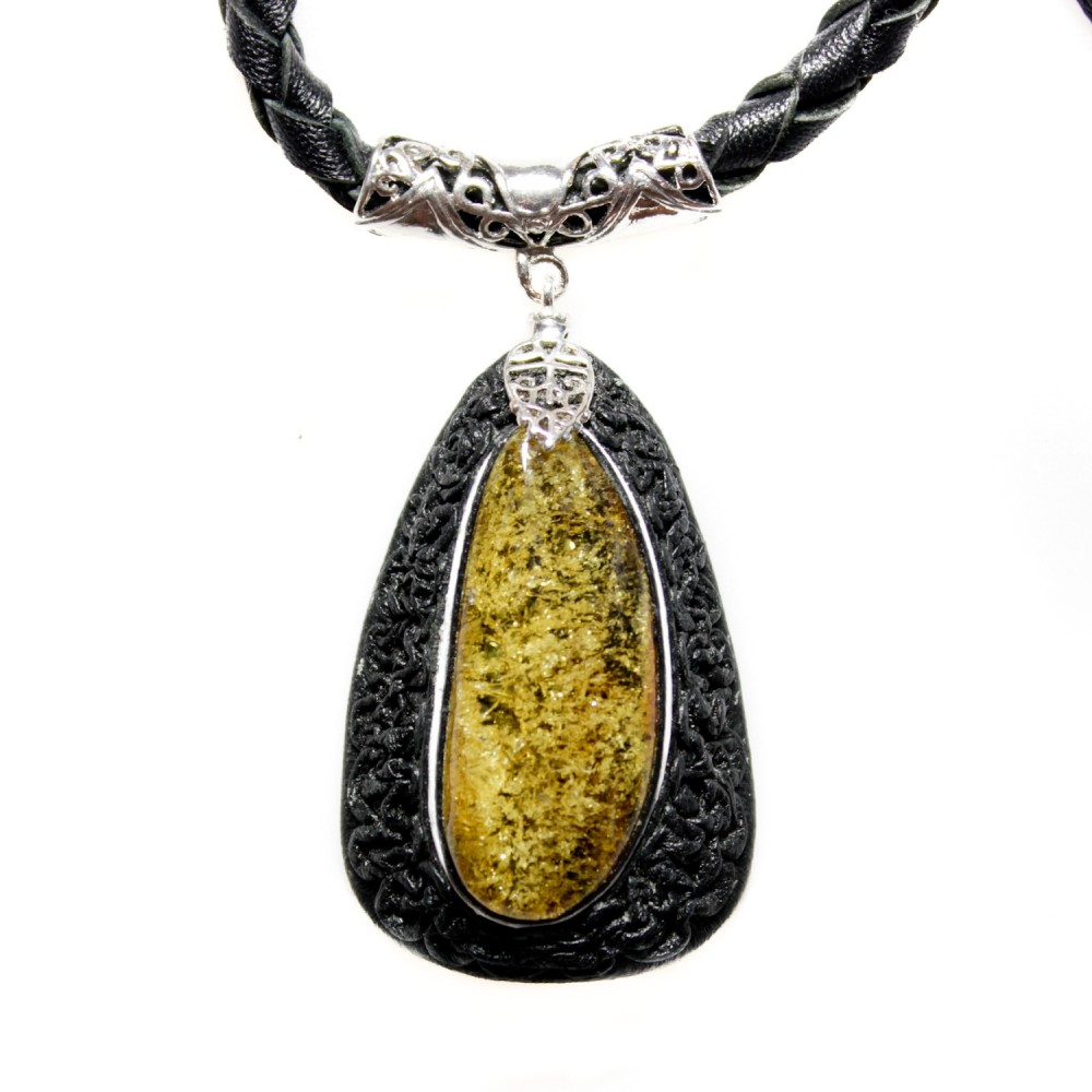 Finery di ambra naturale e pelle verde. unico nel suo genere. P>