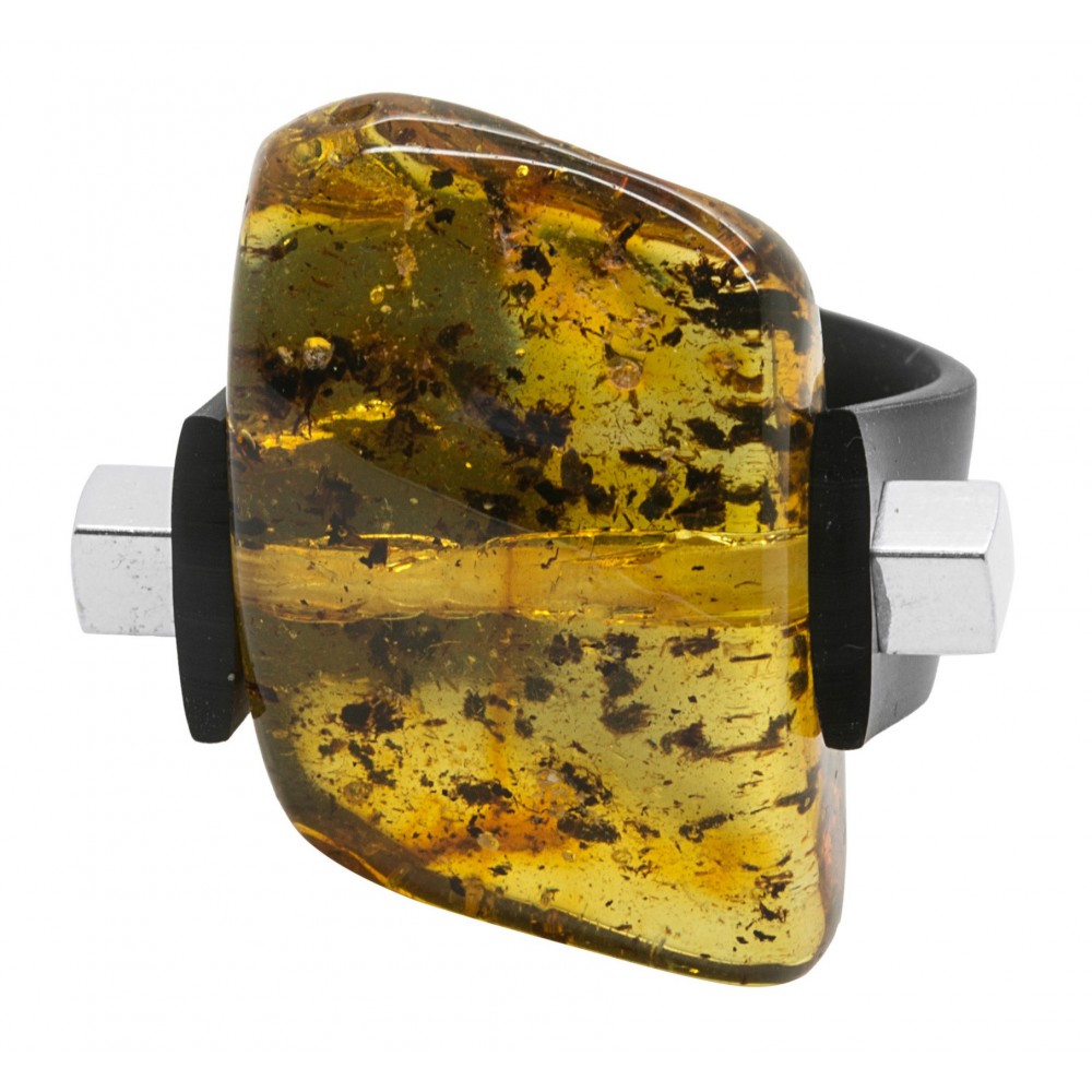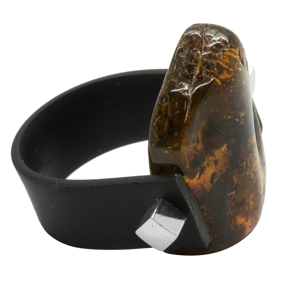 Un anello unico stile molto naturale, anzi ogni pietra ambra è unico e ha un aspetto irregolare. L'anello è montato su un cinturino in silicone che si può facilmente adattarsi a un dito.