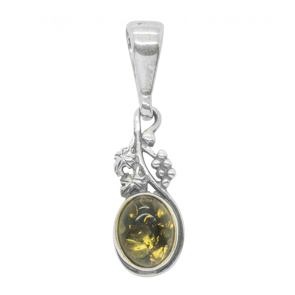 Elegante cabochon ambra naturale colore verde sulla 925/1000 cornice d'argento sormontato da una decorazione vegetale.