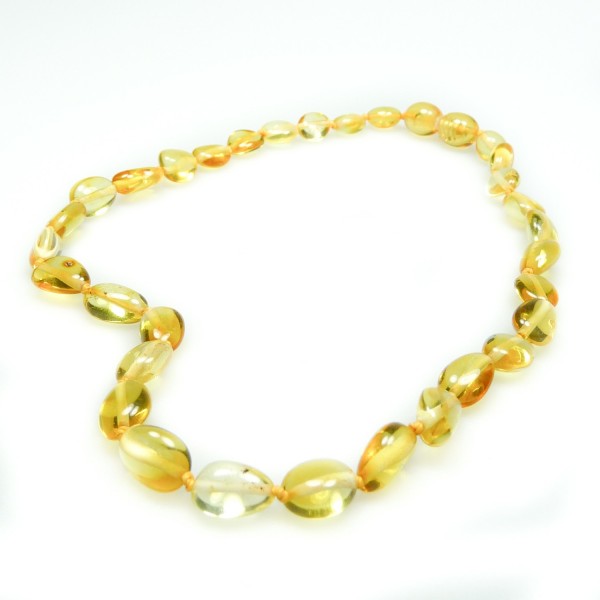 collana bambino ambra fatta di naturale perle d'ambra a forma di colore limone oliva. Ogni perlina ambra e separati da un nodo per fissarlo.
