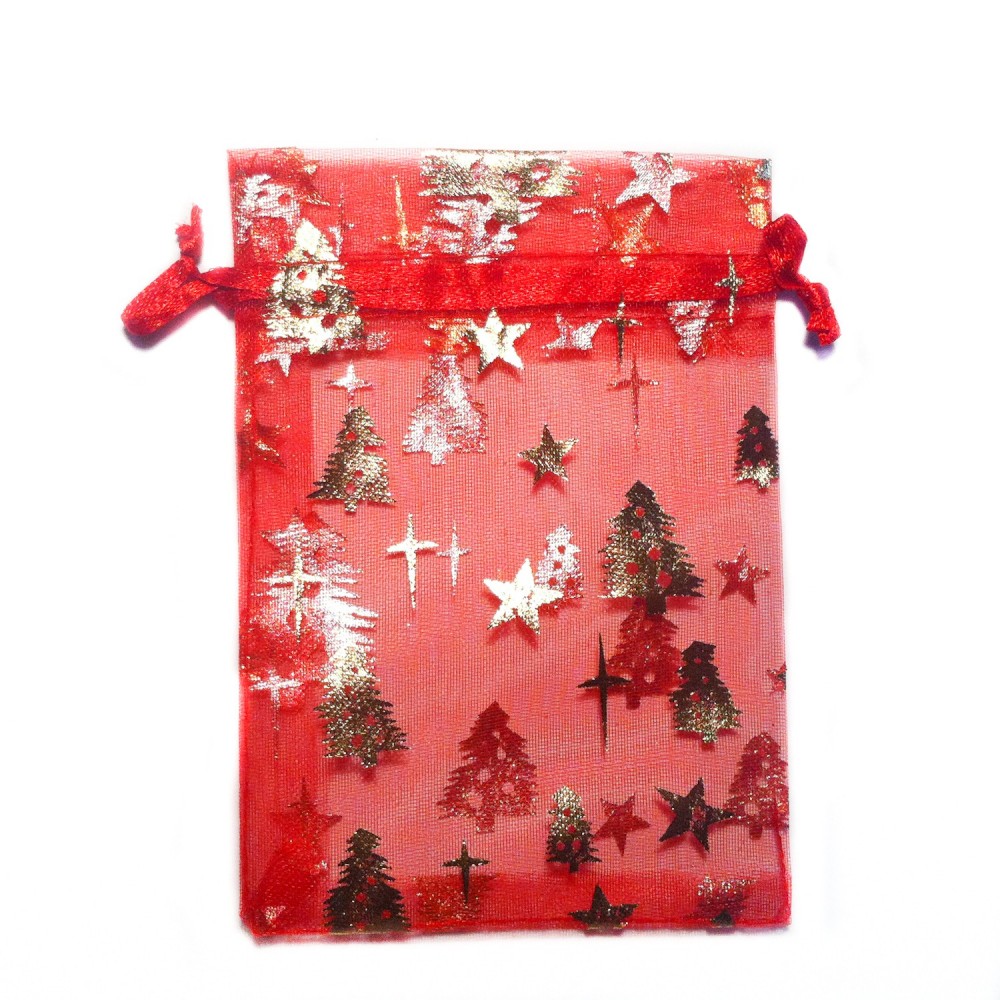 Bustina di organza con rosso albero di Natale decorato con stelle. Dimensioni 8,5 cm x 12 cm