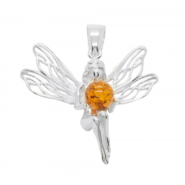 Pendentif Argent 925/1000 en forme de fée associé d'une perle d'ambre naturel couleur cognac.