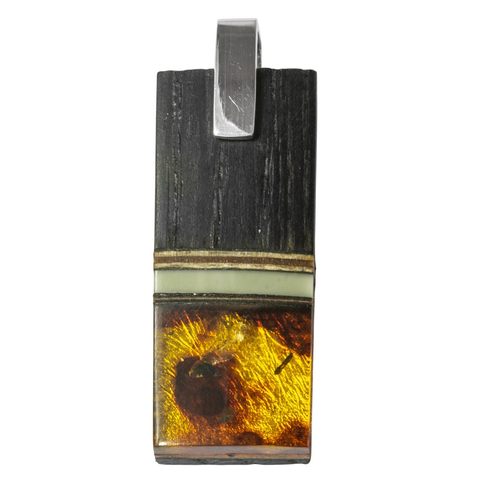 Pendentif en bois précieux avec argent massif et ambre baltique véritable miel et blanc. La pierre d'ambre est placé devant une feuille d'Or massif pour un résultat unique.