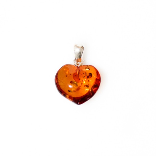 Ajouter un peu d'amour autour de votre cou avec un petit coeur en ambre naturel de couleur cognac remplie d'éclat de lumière accompagné d'une accroche en argent 925/1000.