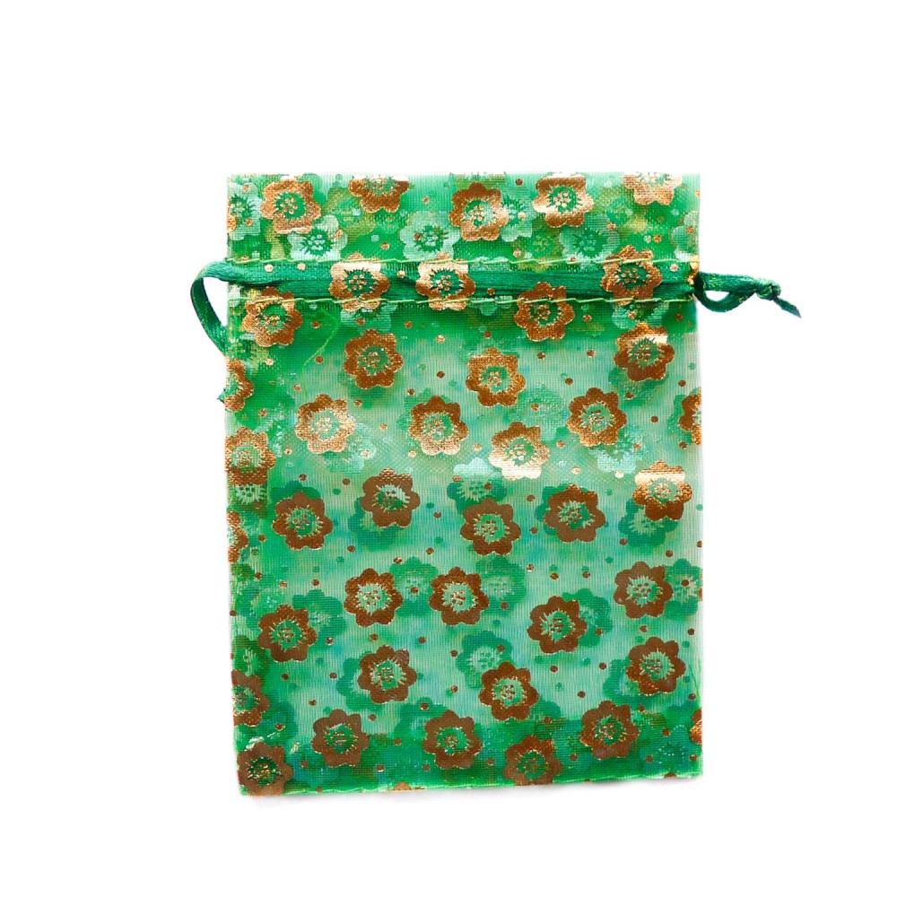 Sachet d'organza couleur vert avec décoration fleur doré. Taille 9 cm x 12 cm