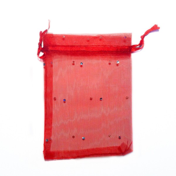 Sachet d'organza couleur rouge avec décoration strass. Taille 8,5 cm x 12 cm