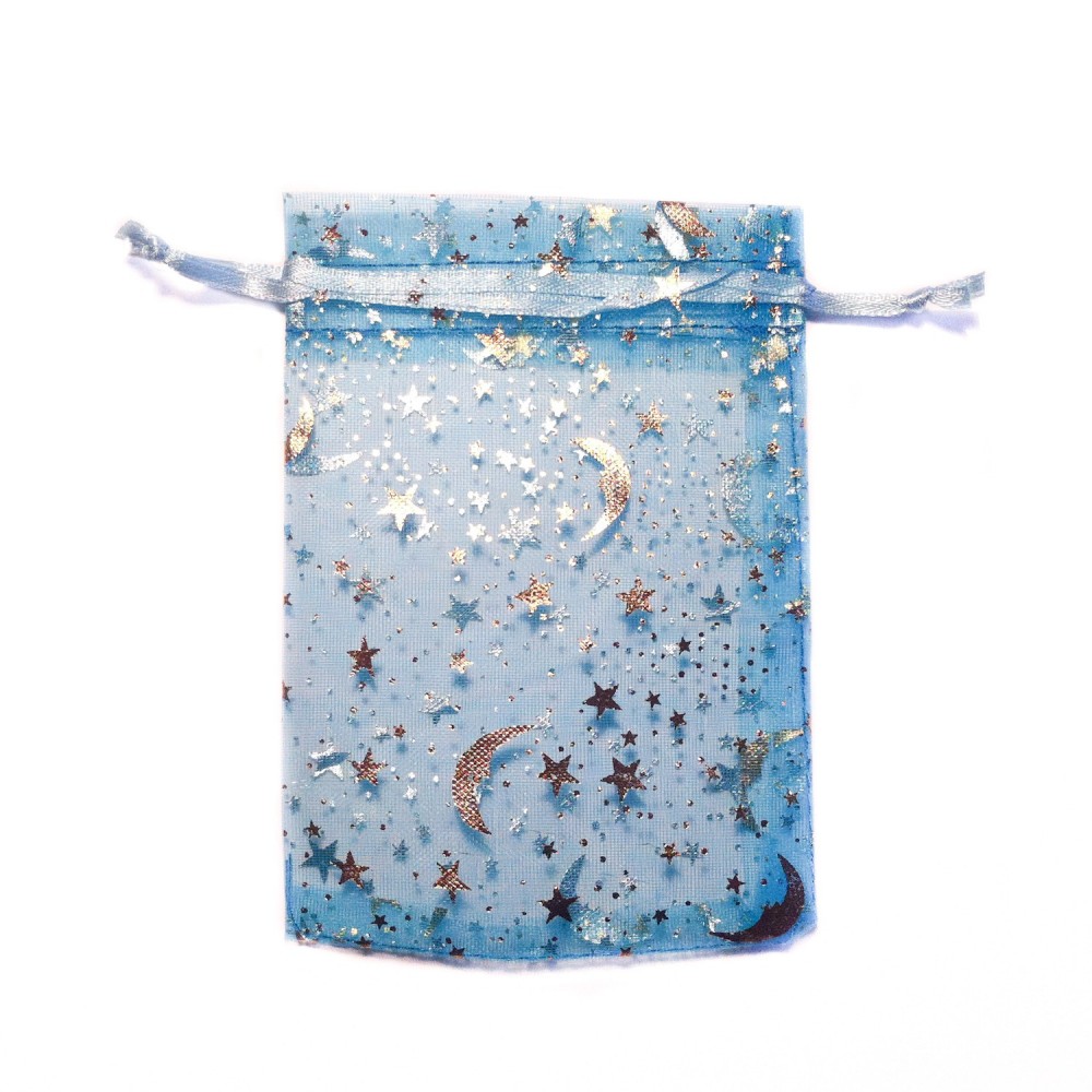 Sachet d'organza couleur bleu azur avec décoration ciel étoilé doré. Taille 8,5 cm x 12 cm